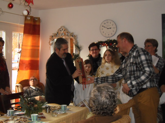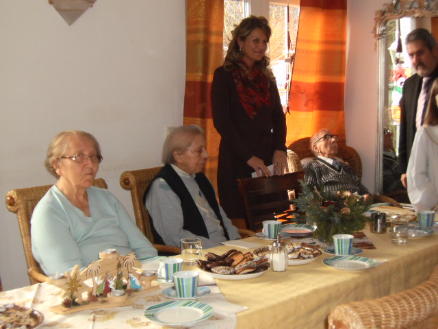 Am 23.12.2012 feierten wir mit den Bewohnern und ihren Angehörigen unsere alljährliche Weihnachtsfeier. Bereits ein paar Tage zuvor hat uns das Christkind mit Herrn Bürgermeister Reger sowie eine Abordnung des Pfarrgemeinderates besucht und Lieder und Gedichte vorgetragen. Bürgermeister Reger überbrachte Grüße des Landrates mit einer Spende für die soziale Betreuung im Herbstblatt. Im Speiseraum der Einrichtung lauschten wir bei Stollen, Plätzchen, Kaffee, Tee und Glühwein den Weihnachtsliedern von Birgit und Florian. Eine kleine Andacht mit Gebeten, Gedichten und Geschichten hatten die Mitarbeiter mit Birgit vorbereitet. Petra und Magdalena haben das Hirtenspiel einstudiert und wurden dafür mit viel Applaus belohnt. Mit kleinen Präsenten wurden die Bewohner beschenkt und bei Brezen, Würstchen und Kraut ließ man den Abend ausklingen.
